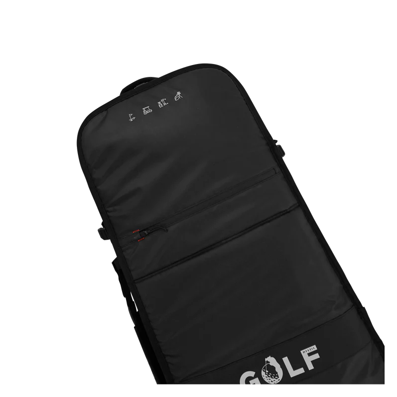 Looking for a discreet way to travel with your gear? Many airlines allow you to travel with a golf bag for free, making the Mystic Golfbag a clever way to save on baggage fees. Its unique shape, with a larger side near the wheels, allows you to load more weight near the base for easier rolling. It features extra protection and padding to prevent wear from sharp fins, and 3D mesh air vents to keep your gear fresh.