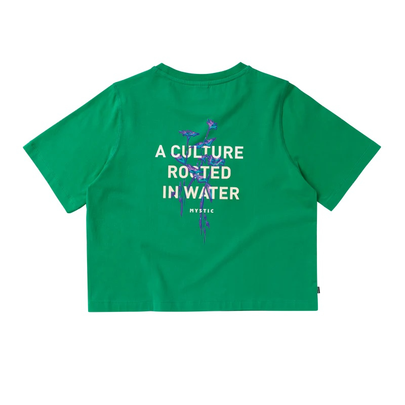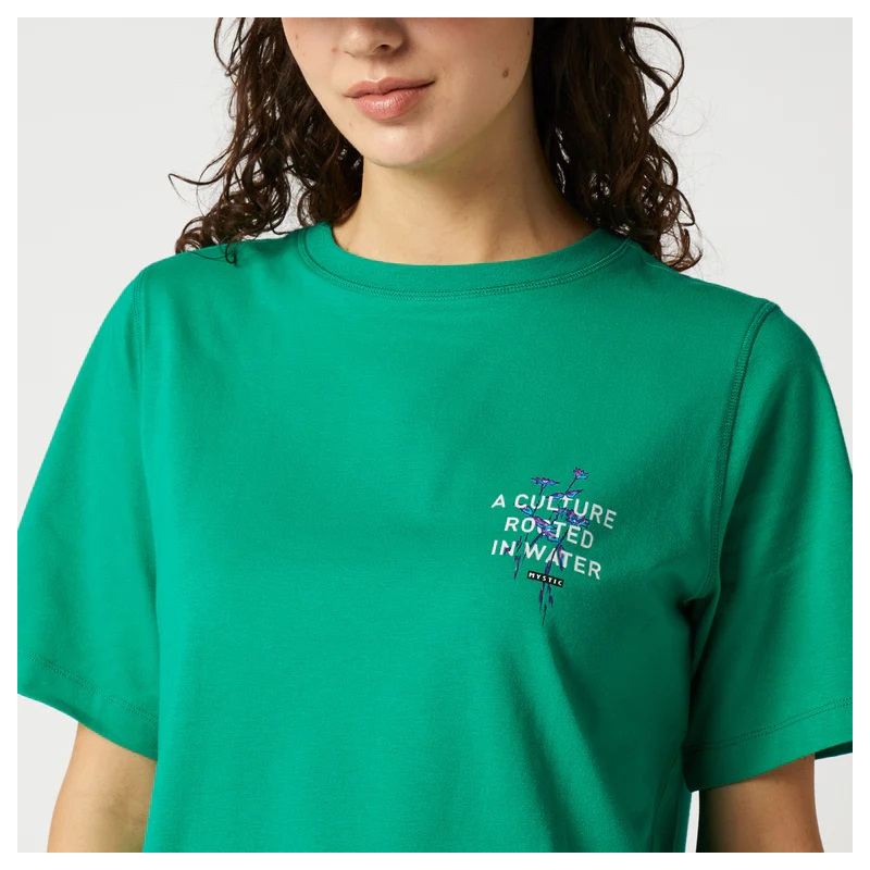 Ženska majica s kratkimi rokavi Mystic Culture, je izdelana iz prvovrstne mešanice bombaža. Na hrbtni strani ima cvetlični potisk, s katerim izraža ukoreninjen način življenja, vezanega na vodo.